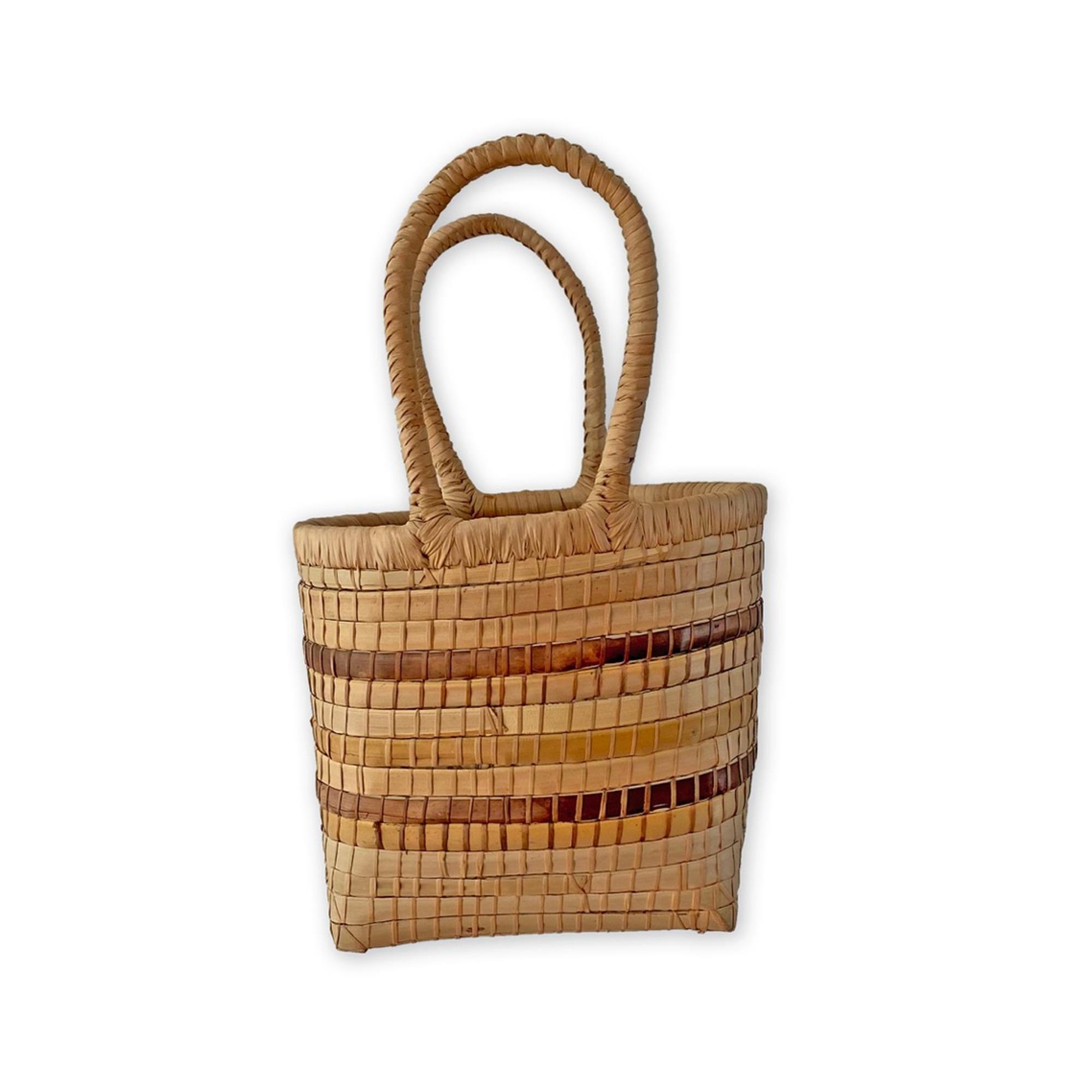Dette produktet er laget av bambus vevet sammen med palmeblader. Stilig og praktisk veske til små handleturer eller annet. Den er 23 cm høy, 24 cm bred og 26 cm lang.