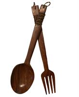 Salatbestikk, brun skje og gaffel med perletråd på toppen